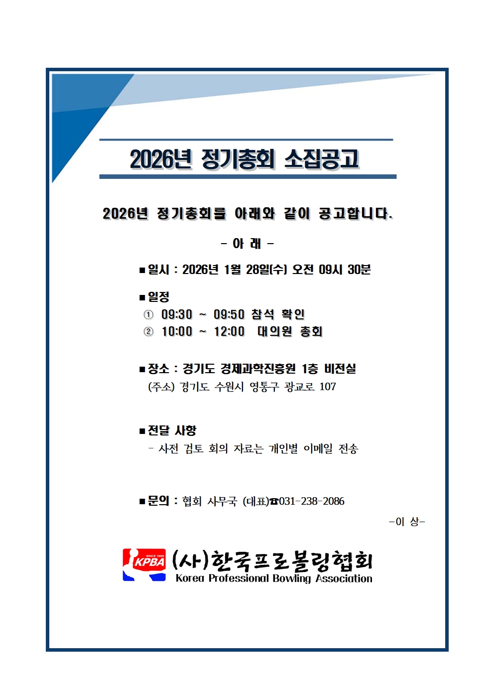 2026년 정기총회 소집공고 페이지 정보 작성자 한국프로볼링 작성일 26-01-23 13:08 조회 719회 댓글 0건 본문 . 추천0 다음글(사)한국프로볼링협회 드릴링(초급) 교육 목록 댓글목록 0 댓글목록 등록된 댓글이 없습니다.